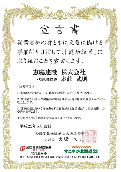 社員が心身ともに元気に働ける事業所を目指して健康経営に取り組むことを宣言し、協会けんぽ北海道支部の健康事業所認定を受けました。協会けんぽ北海道支部の「特定保健指導」を利用します。